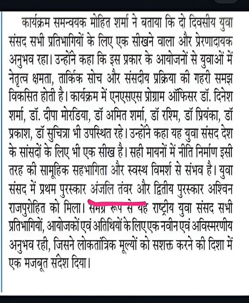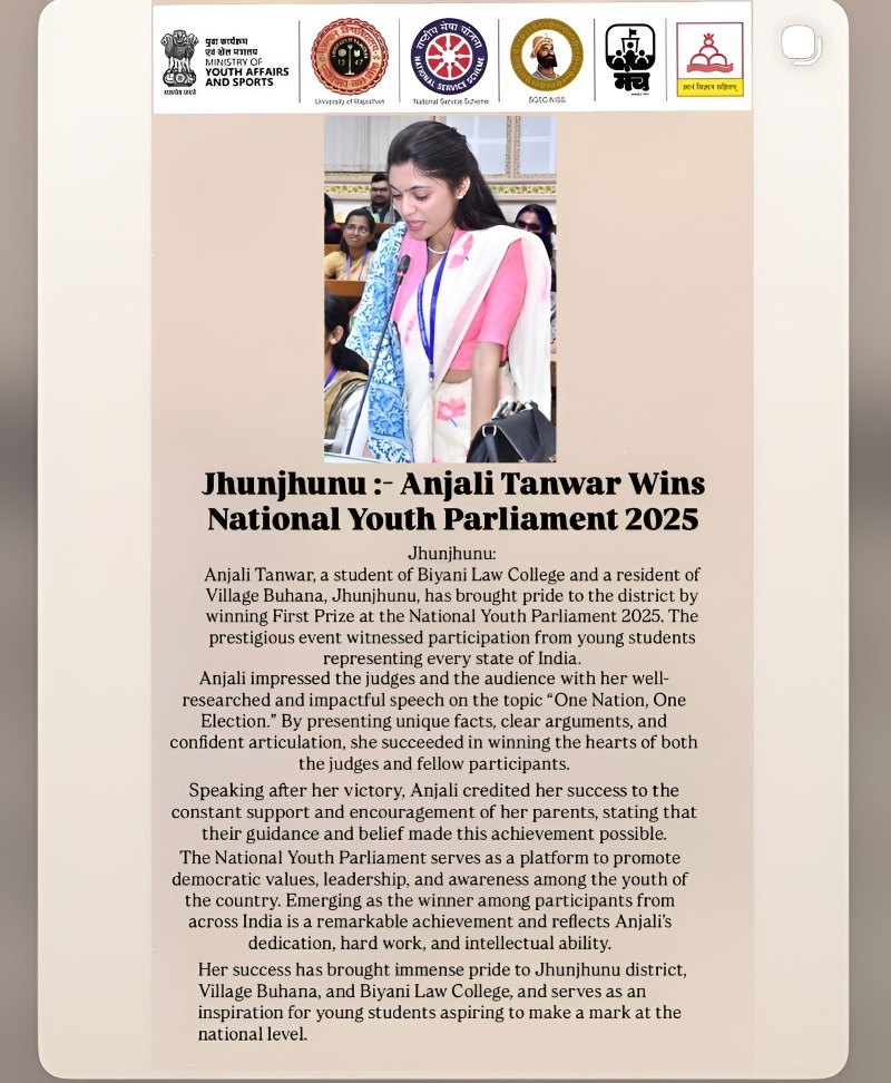 Anjali Tanwar, a student of Biyani Law College, has achieved First Prize at the National Youth Parliament 2025, showcasing exceptional confidence, oratory skills, and an in-depth understanding of national issues. Her well-researched presentation on “One Nation, One Election” reflected strong analytical abilities and clarity of thought. This accomplishment highlights her dedication and serves as an inspiration for aspiring students to excel at the national level.